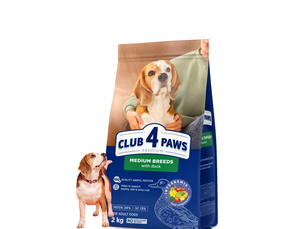 CLUB 4 PAWS PREMIUM S KACHNÍM MASEM. Kompletní suché krmivo pro dospělé psy středních plemen.