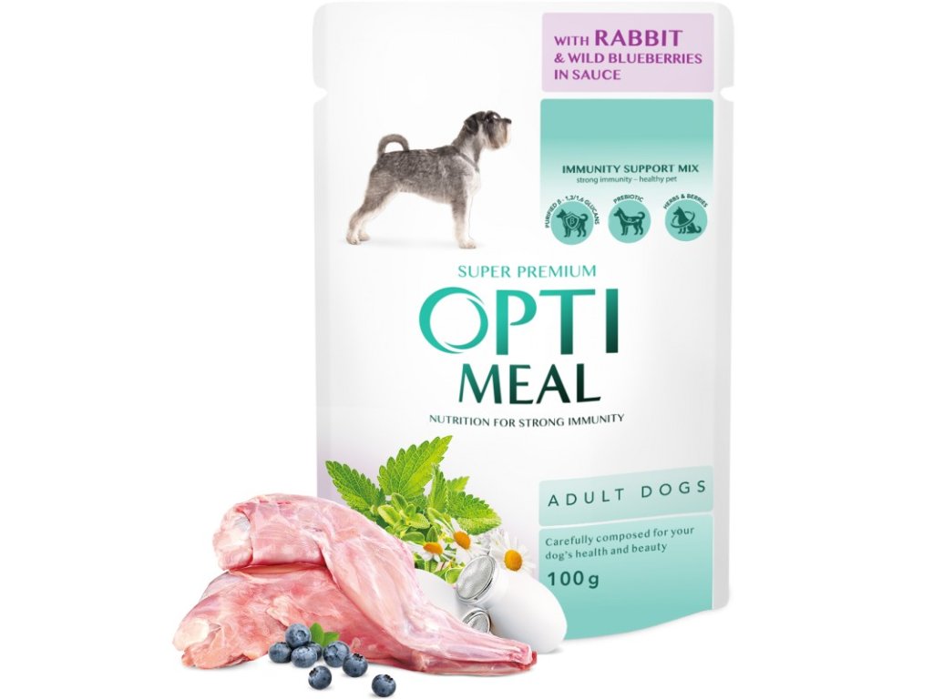 OPTIMEAL ™ KONZERVOVANÉ KRMIVO PRO DOSPĚLÉ PSY S KRÁLIČÍM MASEM A BORŮVKAMI V OMÁČCE