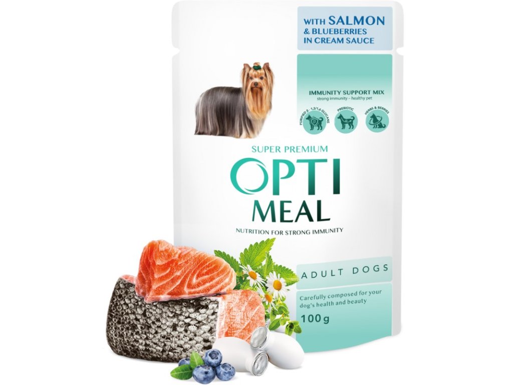 OPTIMEAL ™ KONZERVOVANÉ KRMIVO PRO DOSPĚLÉ PSY S LOSOSEM A BORŮVKAMI V KRÉMOVÉ OMÁČCE