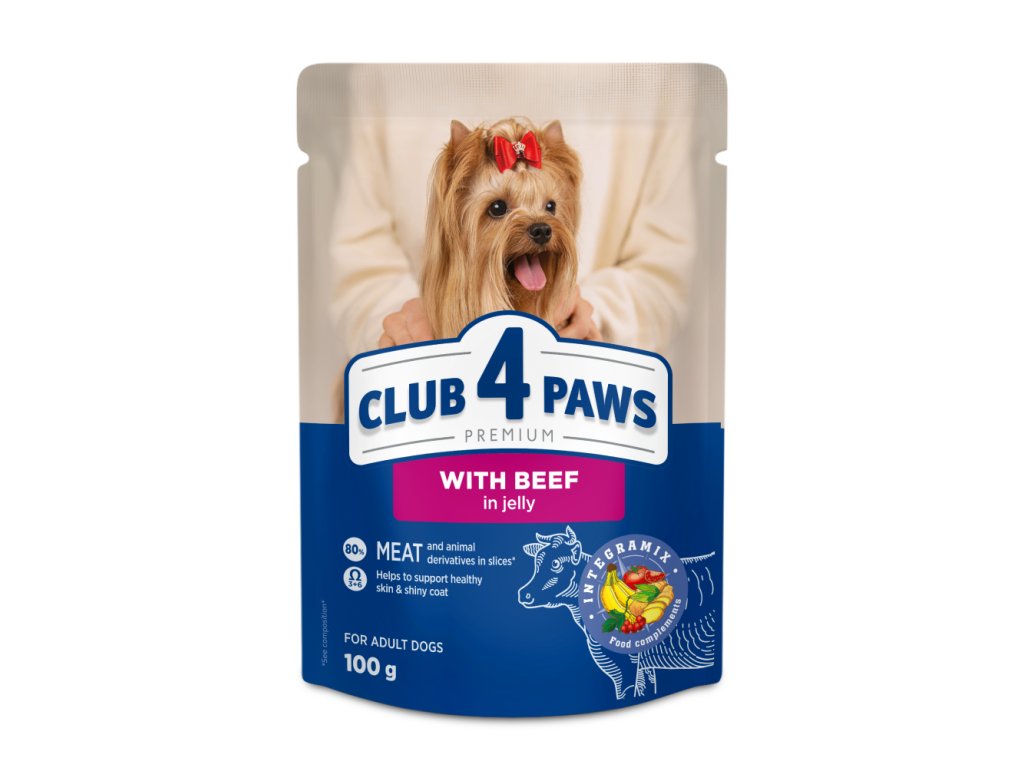 CLUB 4 PAWS PREMIUM „S HOVĚZÍM V ŽELÉ“. KOMPLETNÍ KONSERVOVANÉ KRMIVO PRO DOSPĚLÉ PSY