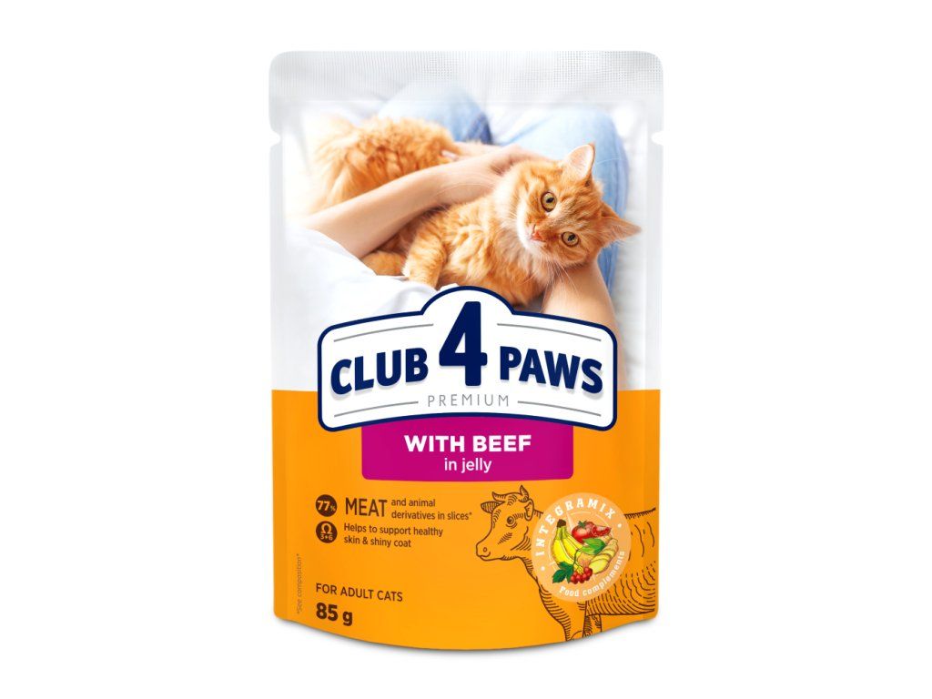CLUB 4 PAWS PREMIUM „S HOVĚZÍM MASEM V ŽELÉ“. KOMPLETNÍ KONZERVOVANÉ KRMIVO PRO DOSPĚLÉ KOČKY.