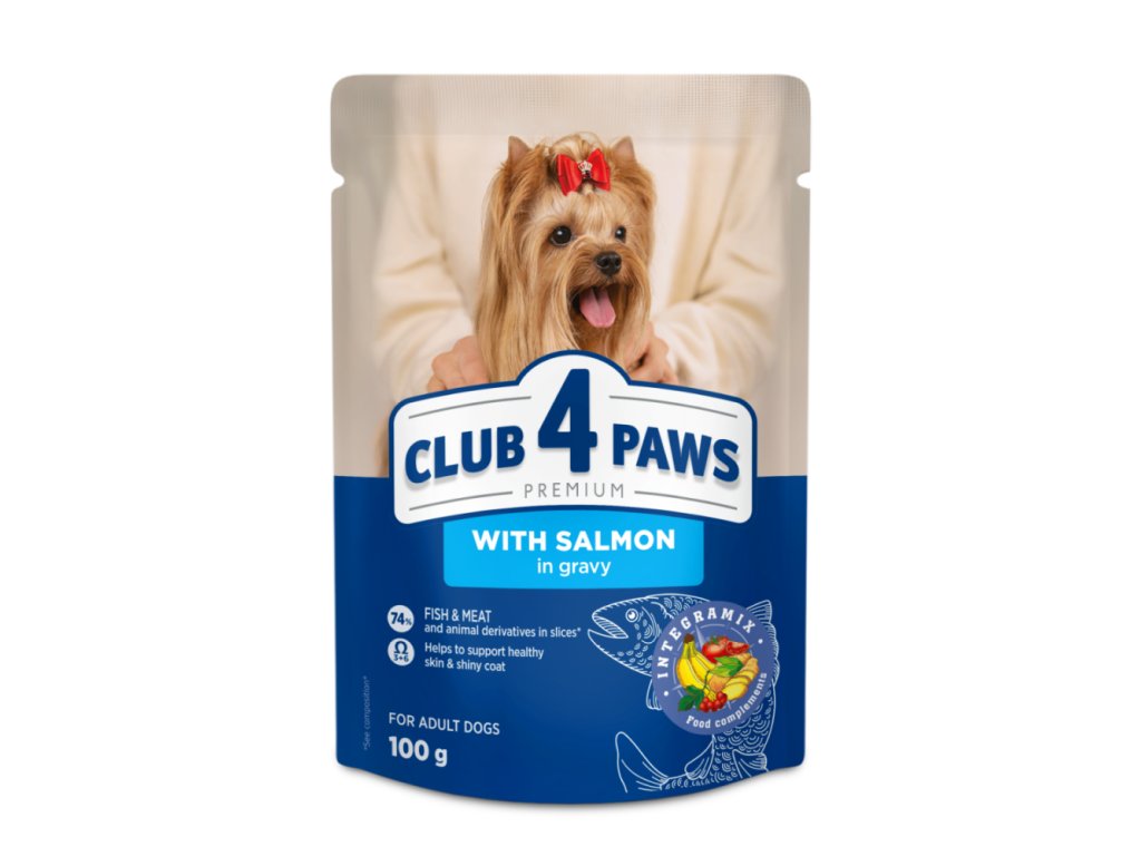 CLUB 4 PAWS PREMIUM „S LOSOSEM V OMÁČCE“. KOMPLETNÍ KONSERVOVANÉ KRMIVO PRO DOSPĚLÉ PSY MINIATURNÍCH A MALÝCH PLEMEN