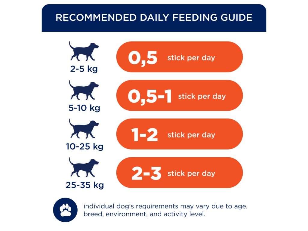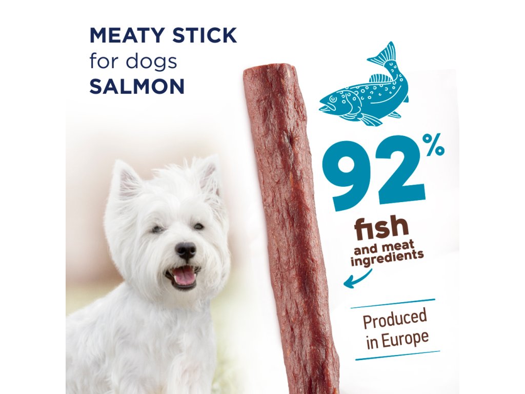 Masové tyčinky obsahují 92 % masných a rybích ingrediencí (včetně 31 % lososa) a komplex vitamínů A, E, D3 a L-karnitin. Bezlepkové pamlsky jsou vyráběné bez použití cukru, sóji, umělých ochucovadel a barviv. Aby si produkt zachoval maximální čerstvost, je každá tyčinka v samostatném metalizovaném obalu. Pamlsky jsou skvělou odměnou za uposlechnutí povelu na procházce nebo na výletě i vhodnou přesnídávkou mezi pravidelným krmením.