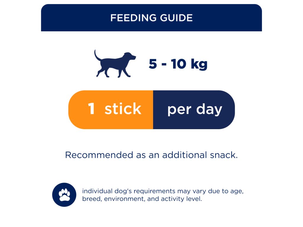 Pro malé dospělé psy (5–10 kg) 1 dentální tyčinka denně. Individuální potřeby psů se mohou lišit v závislosti na věku, plemeni, prostředí a úrovni aktivity.
