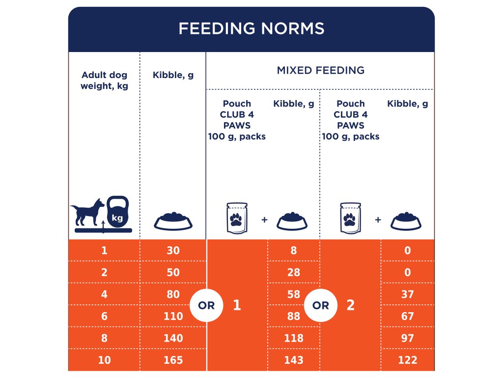 Doporučená denní krmná dávka: Dávkování je uvedeno v tabulce krmení. Kombinujte s konzervovaným krmivem CLUB 4 PAWS pro dospělé psy.