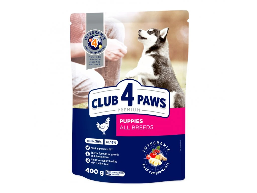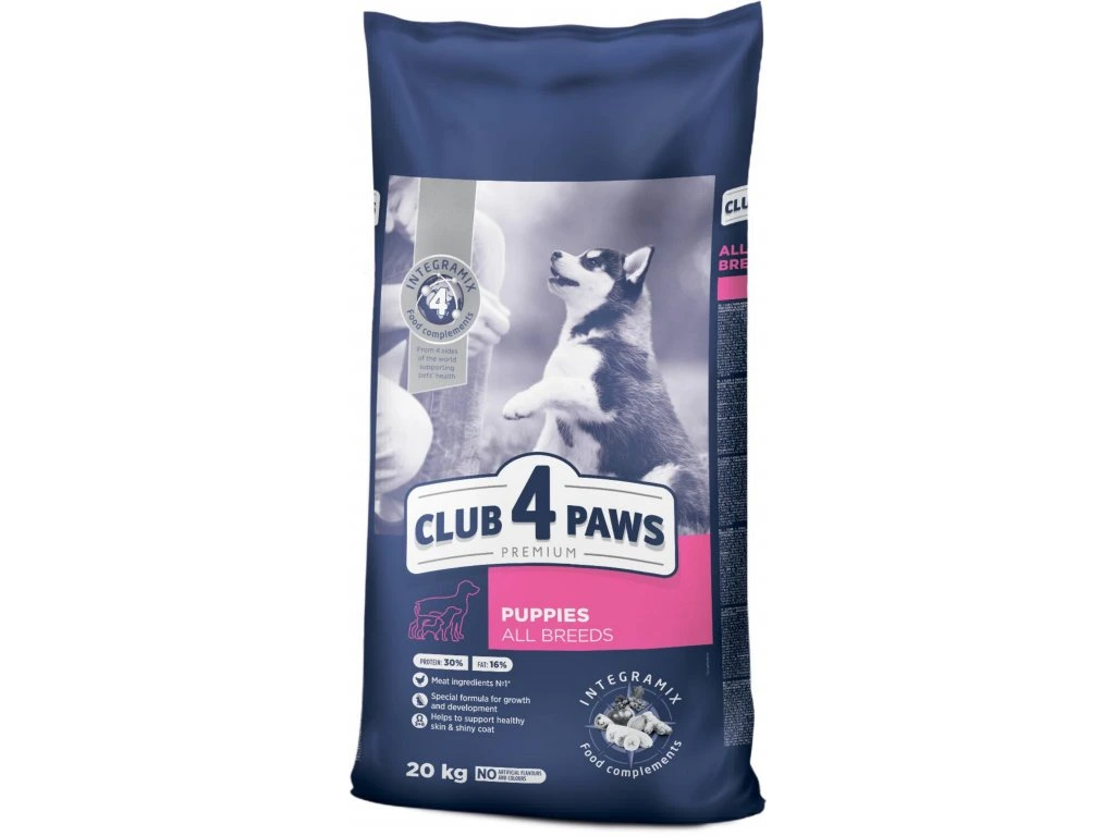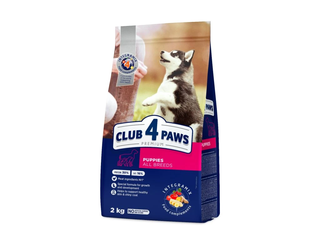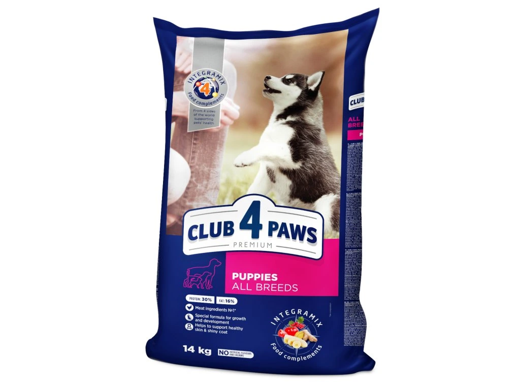 CLUB 4 PAWS PREMIUM S VYSOKÝM OBSAHEM KUŘECÍHO MASA. Kompletní suché krmivo pro štěňata všech plemen.