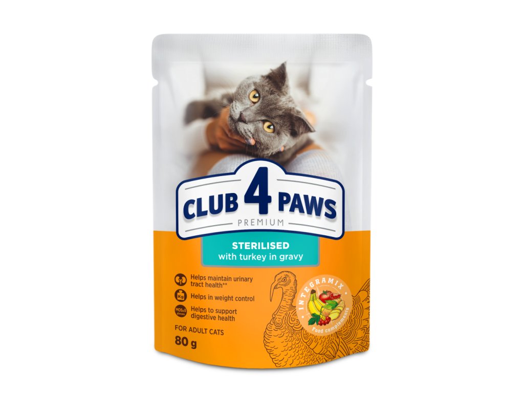 CLUB 4 PAWS PREMIUM „S KRŮTÍM MASEM V OMÁČCE“. KOMPLETNÍ KONZERVOVANÉ KRMIVO PRO DOSPĚLÉ KASTROVANÉ KOČKY