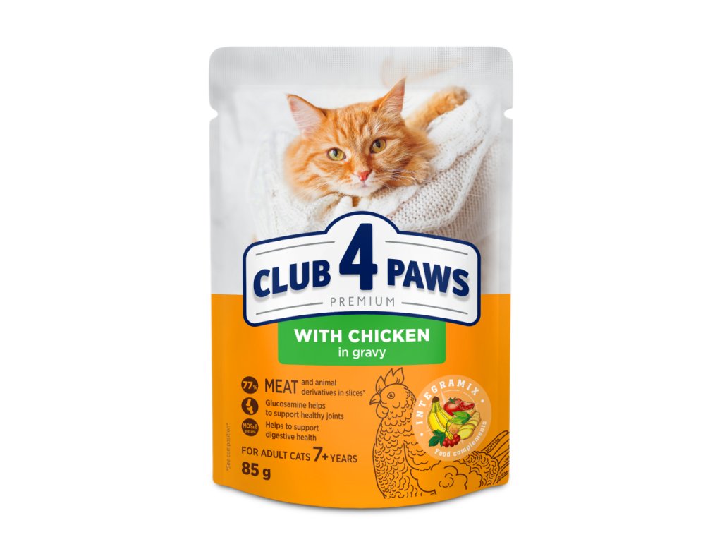 CLUB 4 PAWS PREMIUM „S KUŘECÍM MASEM V OMÁČCE“. KOMPLETNÍ KONZERVOVANÉ KRMIVO PRO KOČKY OD 7 LET.