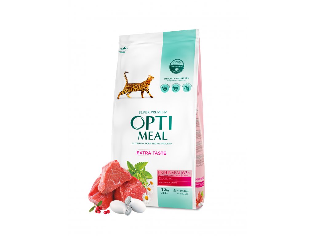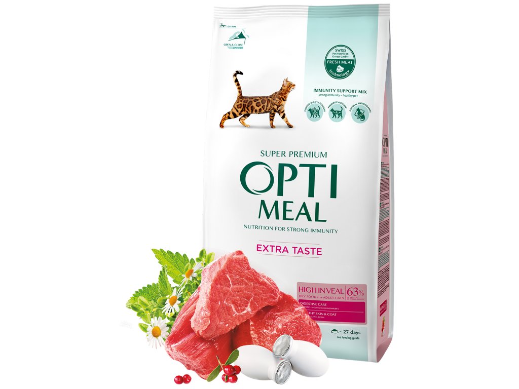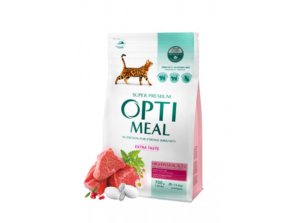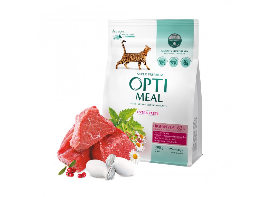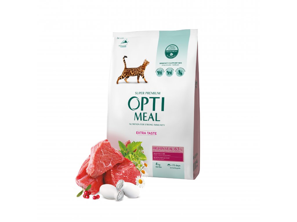 OPTIMEAL™. Kompletní suché krmivo s vysokým obsahem telecího masa pro dospělé kočky.
