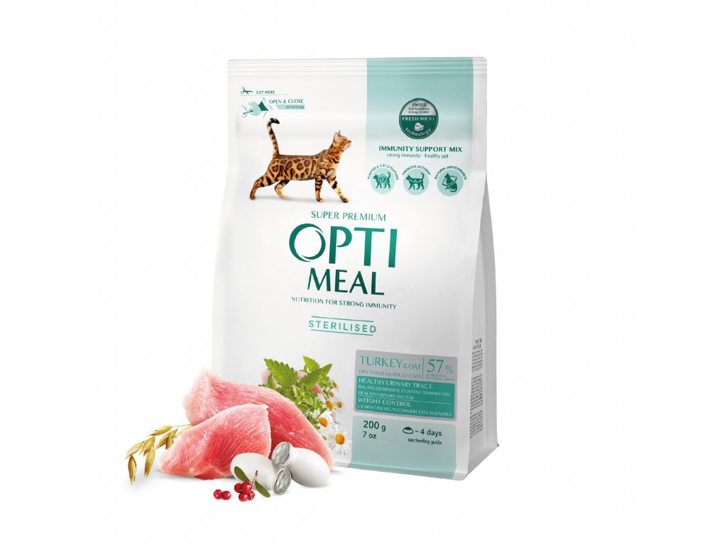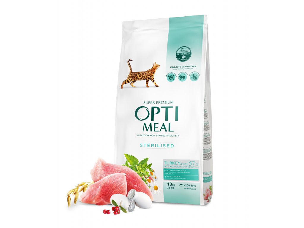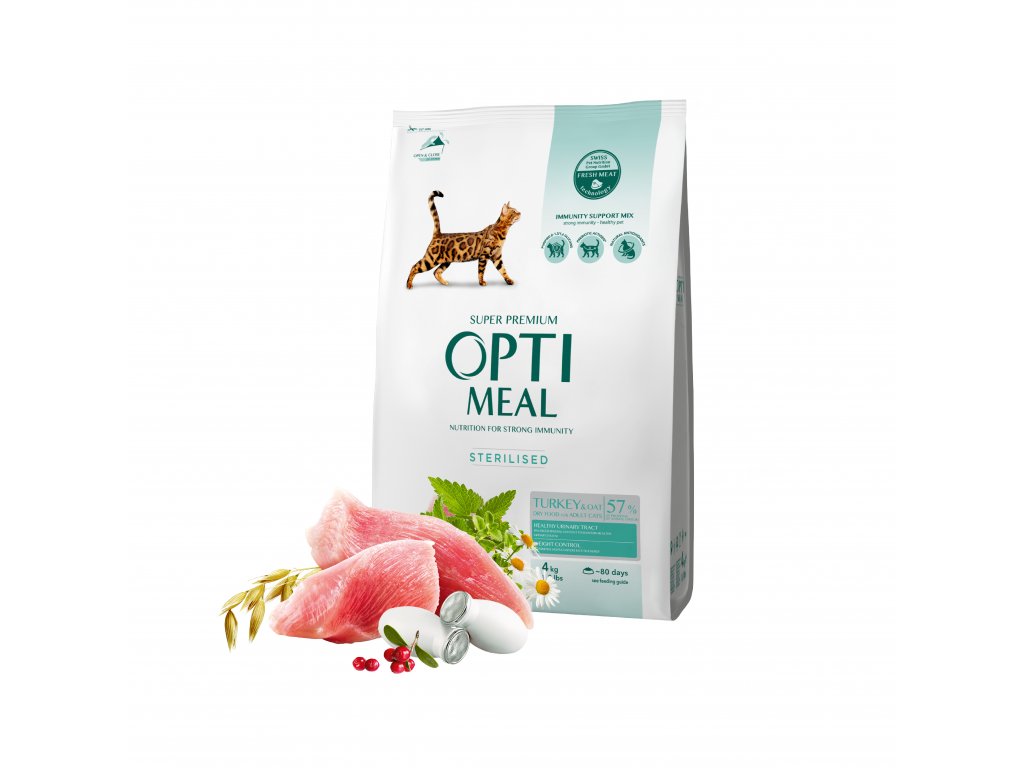 Optimeal kočičí krmivo pro dospělé sterilizované kočky s krůtím masem a ovsem – superprémiové krmivo pro kočky vyvinuté pod dohledem veterinářů a vyráběné s využitím technologie švýcarské společnosti Swiss Pet Nutrition Group GmbH. Unikátní receptura pro silnou imunitu domácího mazlíčka obsahuje Immunity Support Mix a pečlivě vybrané masné ingredience, zeleninu, byliny a bobule. To vše přispívá ke každodenní přirozené ochraně imunitního systému vaší kočky.