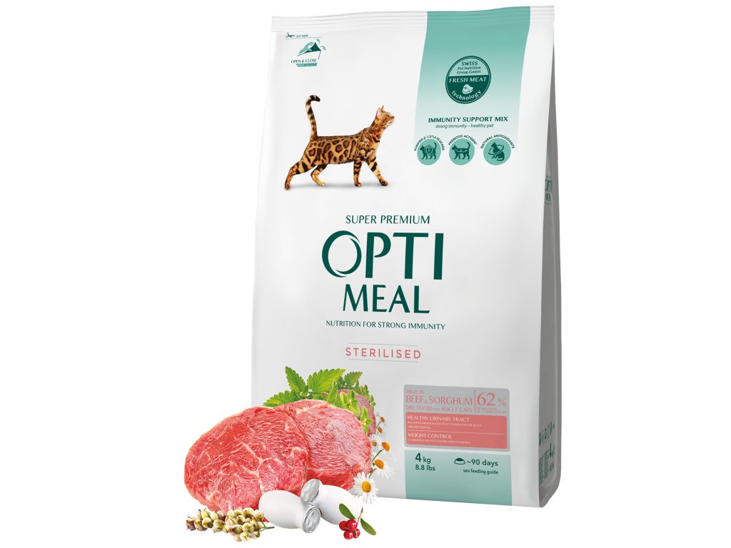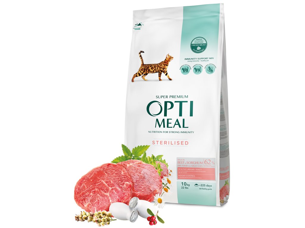 OPTIMEAL™. Kompletní suché krmivo pro sterilizované kočky a kastrované kocoury - s vysokým obsahem hovězího masa a čiroku